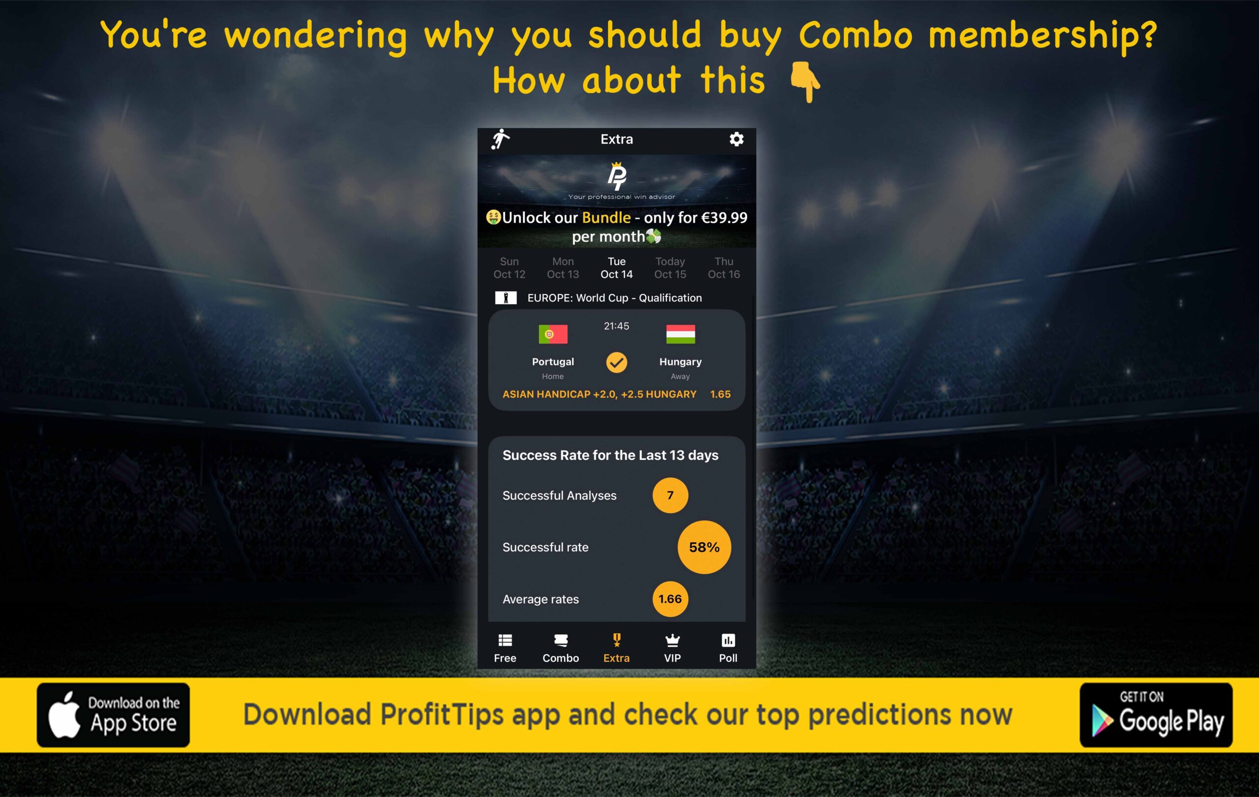 📲 In our new membership EXTRA you can find top single matches with high odds. Grab our Bundle – Combo, Extra and VIP now for our PROMO price €39.99.