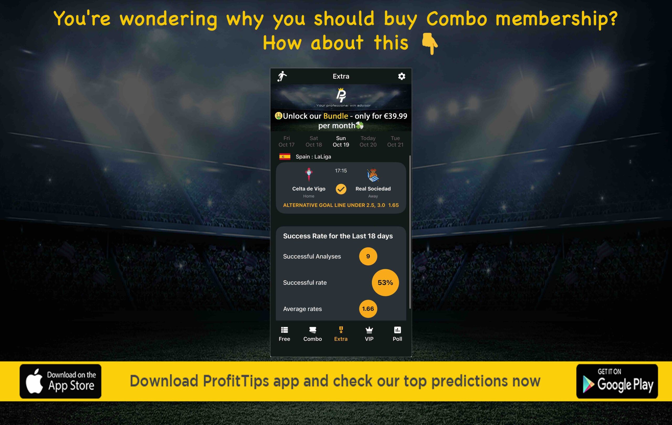 📲 In our new membership EXTRA you can find top single matches with high odds. Grab our Bundle – Combo, Extra and VIP now for our PROMO price €39.99.