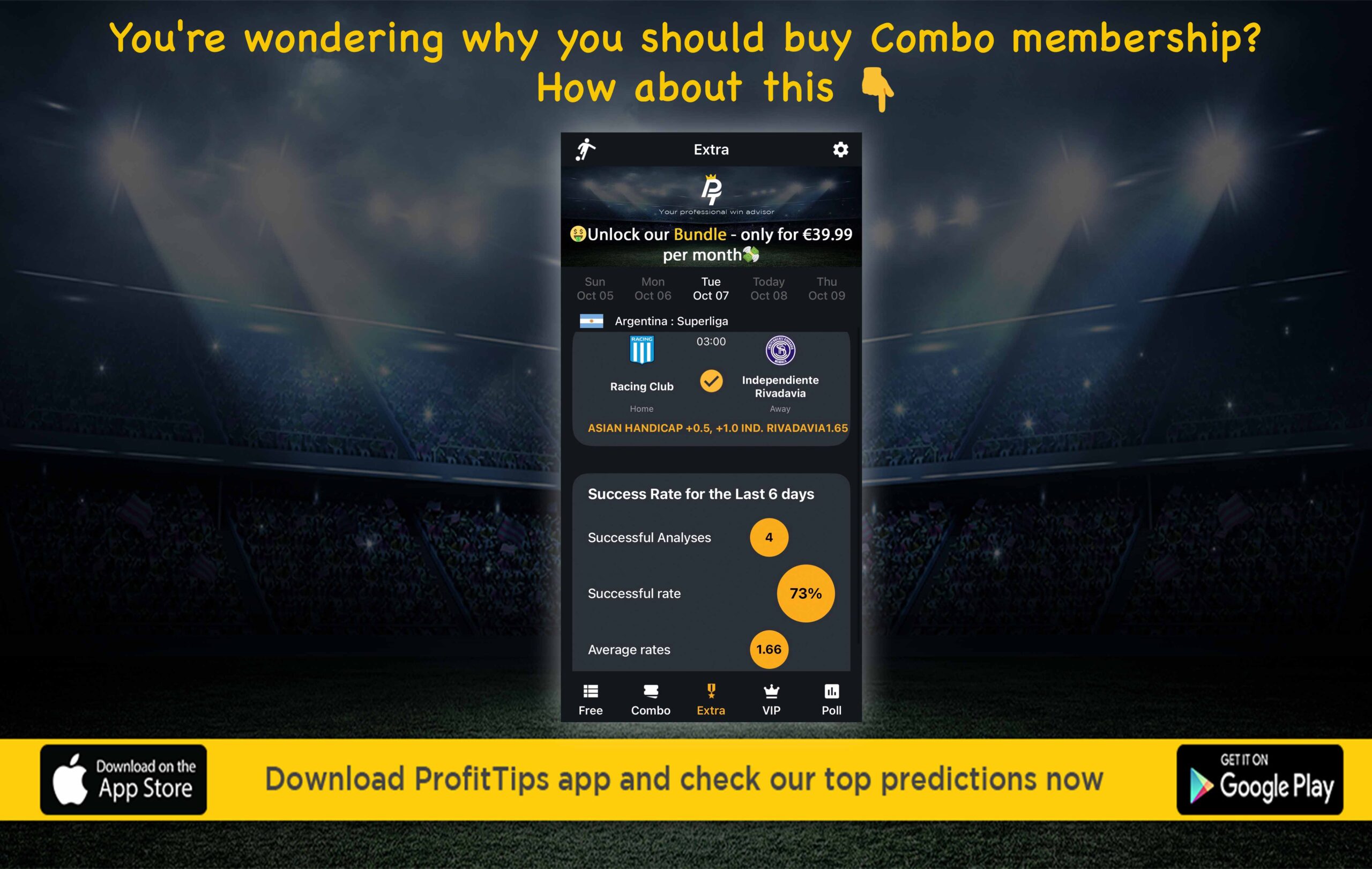 📲 In our new membership EXTRA you can find top single matches with high odds. Grab our Bundle – Combo, Extra and VIP now for our PROMO price €39.99.